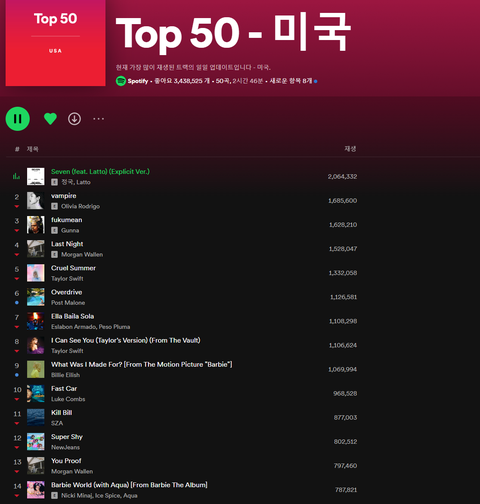 스포티파이 미국 스트리밍 일간 차트