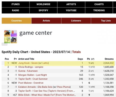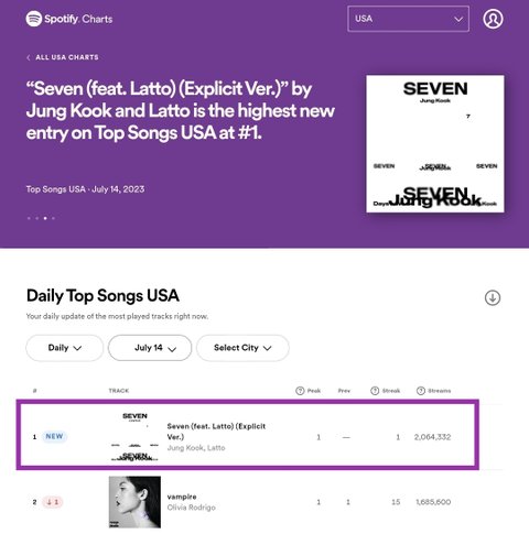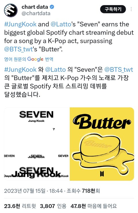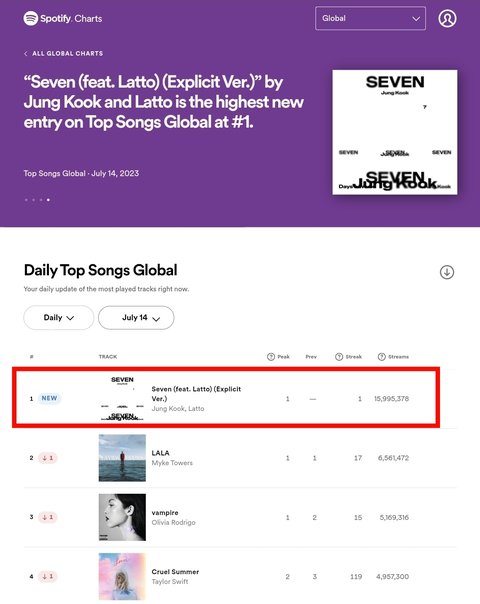 이번 솔로곡 세븐 글로벌 스포티파이 데일리 스트리밍이
