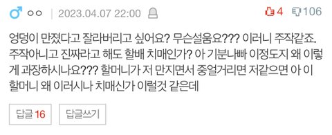나도 3개월 전쯤에 사람 빽빽한 버스에서 어떤 할배가 내 엉덩이 움켜쥠. 만원버스 몇 번 안 타본 것도 아니고 이건 너무나도 고의라는 게 느껴졌음. 진짜 개불쾌하고 엉덩이 뜯어버리고 싶었거든? 그걸로 판에 글도 한 번 올렸었는데 이딴 댓글도 소수지만 몇 개 달려서 개역겨웠음 ㅠ;; 아직도 버스 탈 때 엉덩이쪽 가리듯이 경계?하면서 탐..