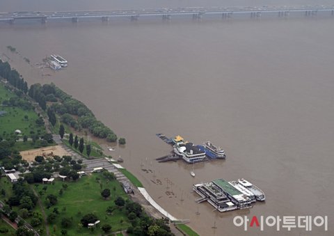 한강 공원 전부다 잠기고 다리 기둥이 거의 보이지 않을 정도로 차오른 모습