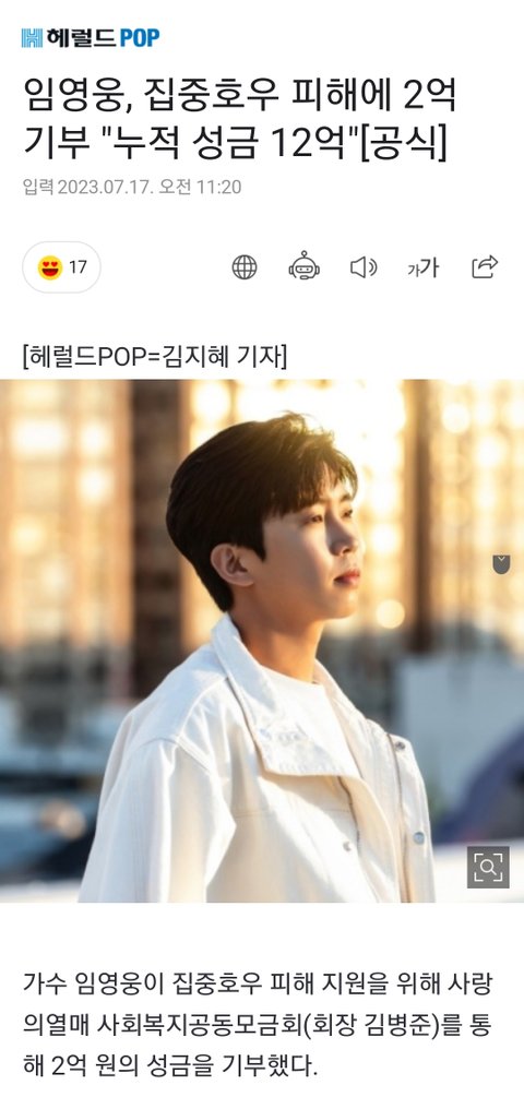 임영웅 수해 피해 성금 2억 기부함ㄷㄷ