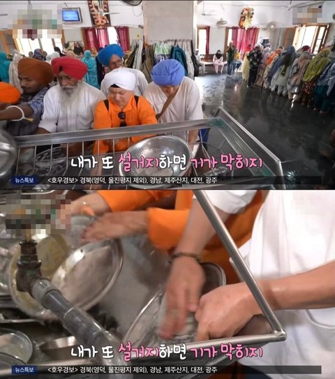 식사를 마치고 설거지 자원봉사에 참여하는 세 사람