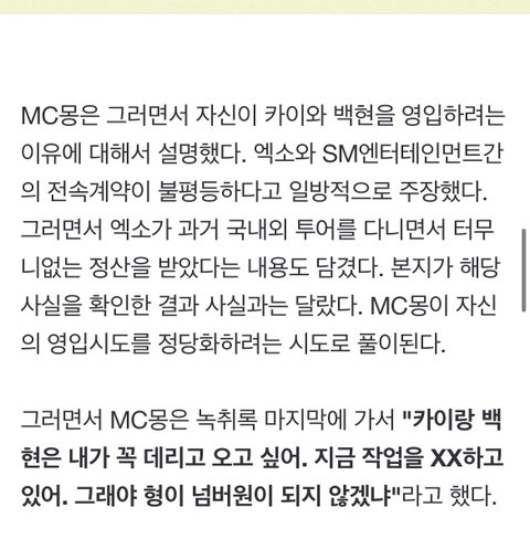저번에 계약 관련 분쟁도 스엠이 엠씨몽이 접근한다는 업계 썰 들은 것 때문에 생겼던 건데 이제는 썰이 아니라 진짜로 어그로를 끄네