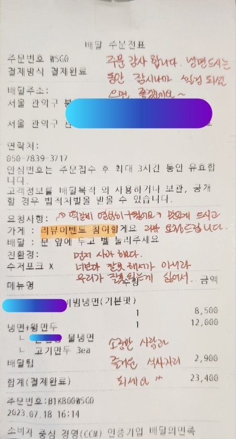 제목그대로 배민 영수증에 이상한 글이 있어서요. 음식도 괜찮았고 정성껏 적은 손글씨 메모도 따로 있었어요. 신경써서 음식하는 집이구나 했음.