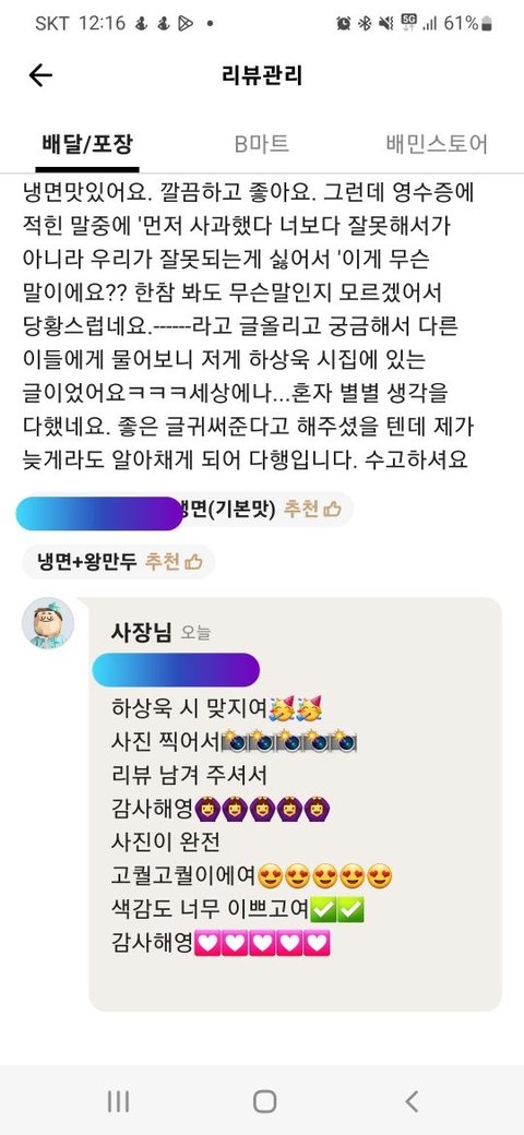 배민 리뷰에 사장님이 댓글 달아주셨어요.