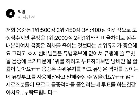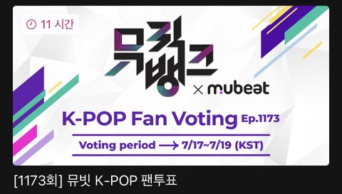 짹에서 본 건데 음중은 2위 순위 유지, 뮤뱅은 격차를 벌리는 게 중요하대 (이미 알고 있으면 미안 난 몰랐어서) 뮤뱅 시간 얼마 안 남았으니까 뮤뱅에 조금이라도 더 많이 하는 게 좋을 거 같아 계정 여러 개로 하면 좋지만 한 번만 해줘도 큰 힘 되니까 아직 안 했으면 하고 오자!!