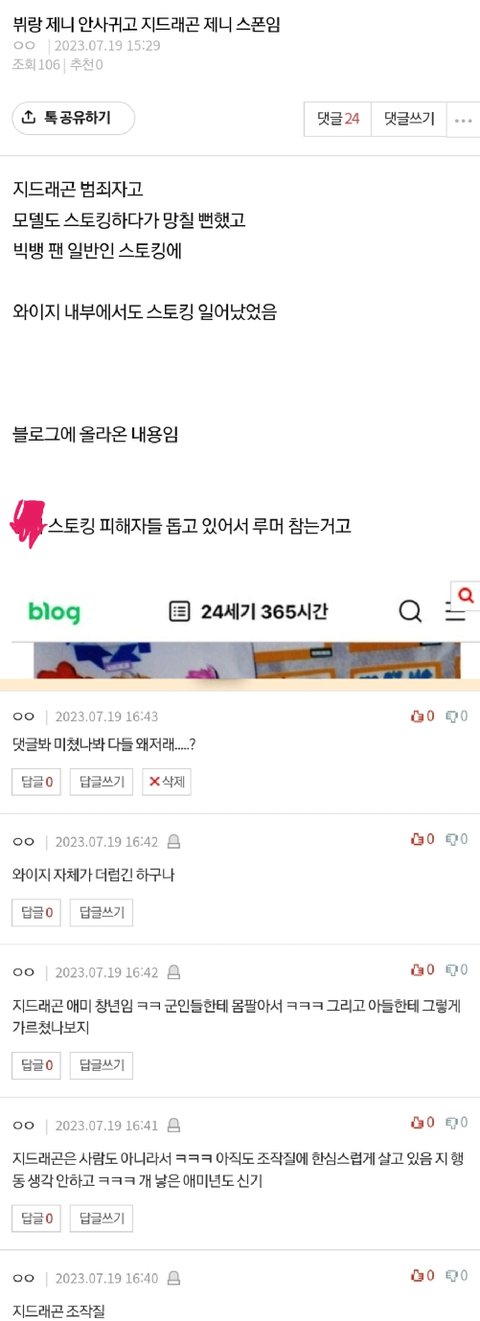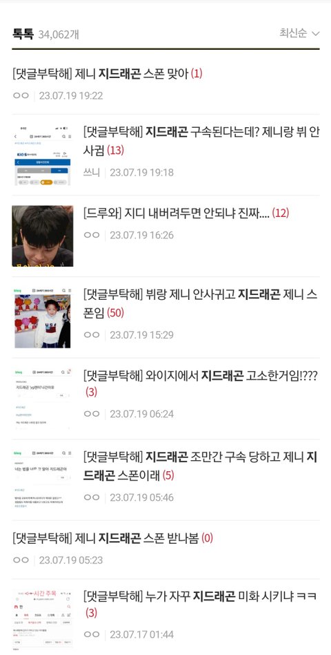 지드래곤 치면 얼마전부터 계속 스토킹 글이 올라옴꾸준히 올리는데 반응 미미하니까반응 터질때까지 쓰는듯