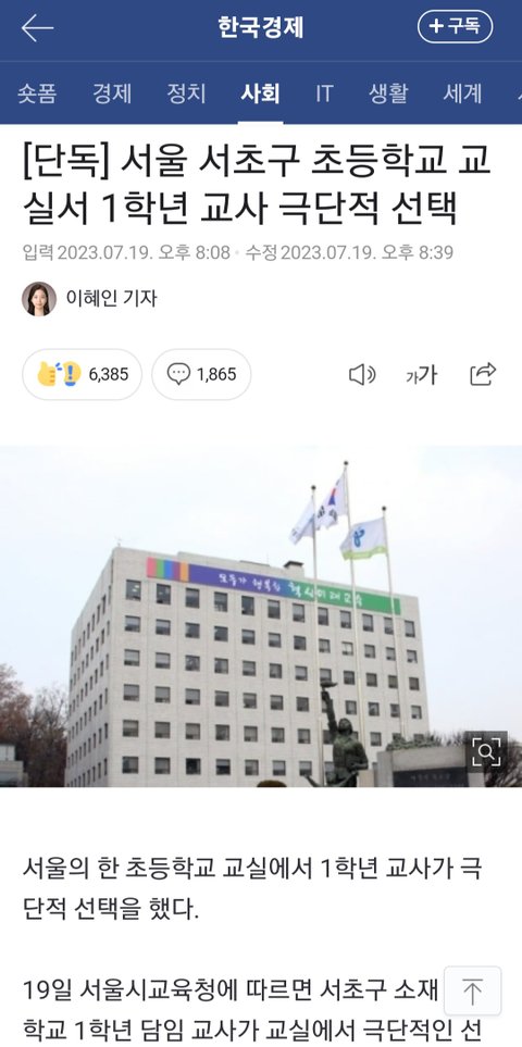 [단독] 서울 서초구 초등학교 교실서 1학년 교사 극단적 선택