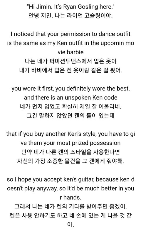 대충 번역하면 우리가 같은 옷을 입은 줄 알았고 니가 제일 잘 입었어?너한테 기타를 주고 싶다고ㅋㅋㅋ 퍼투댄 뮤비 지민이 옷이랑 라이언 고슬링 켄 옷 비슷해서 혹시나 했는데 모티브가 된 게 맞나봄! 이왜진 지민아ㅋㅋㅋㅋ