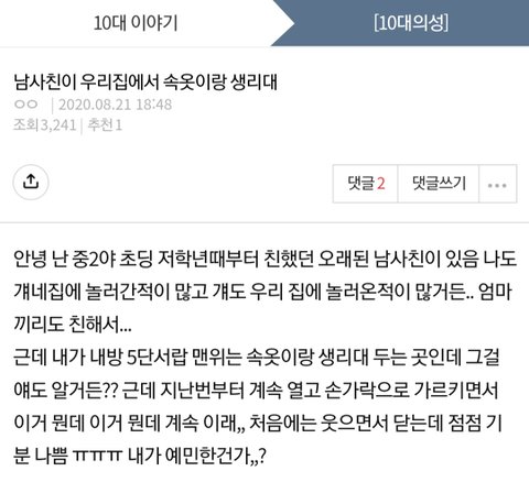 안녕 난 중1이야 초딩 저학년때부터 친했던 오래된 남사친이 있음 나도 걔네집에 놀러간적이 많고 걔도 우리 집에 놀러온적이 많거든.. 엄마끼리도 친해서... 근데 내가 내방 5단서랍 맨위는 속옷이랑 생리대 두는 곳인데 그걸 얘도 알거든?? 근데 지난번부터 계속 열고 손가락으로 가르키면서 이거 뭔데 이거 뭔데 계속 이래,, 처음에는 웃으면서 닫는데 점점 기분 나쁨 ㅠㅠㅠ 내가 예민한건가,,?