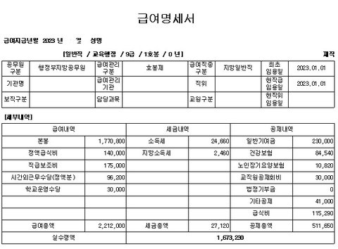참고: 신규 공무원이라 정근수당 없음, 성과금 없음