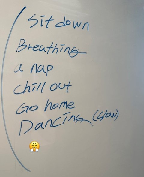앉기 - 숨쉬기 - 낮잠 - 쉬기 - 집에 가기 - 춤추기 (느리게)