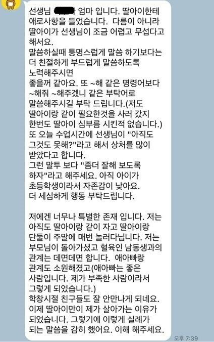 근데 주의해야할게 ’아직도 그것도 못해?‘라는 말을 한 적이 없을수도 있습니다 왜곡이 되었다거나 그런 말투가 전혀 아니었는데 그렇게 받아들였을수도 있고 자기 멋대로 생각하기도 합니다 초등학생들은요.. 저번 톡선에 ‘도덕책을 안 가져온 사람들은 수업내내 뒤에 서있어야한다’라는 말을 들었다고 따졌는데, 아예 그런 말을 한 적이 없었던 것처럼.. 만약 과장된게 없다면 이건 교사가 실수한게 맞아요. 아이들은 상처받을 수 있습니다 ㅜㅜ