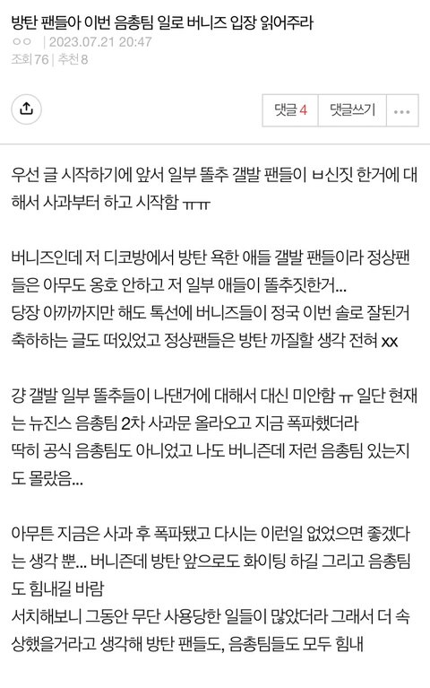 뉴진스 팬 입장입니다... 일부 똘추들 때문에 피해끼친거 대신 미안해요