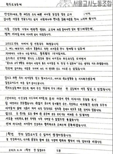 서이초 선생님이 작년 학부모들에게 썼던 편지