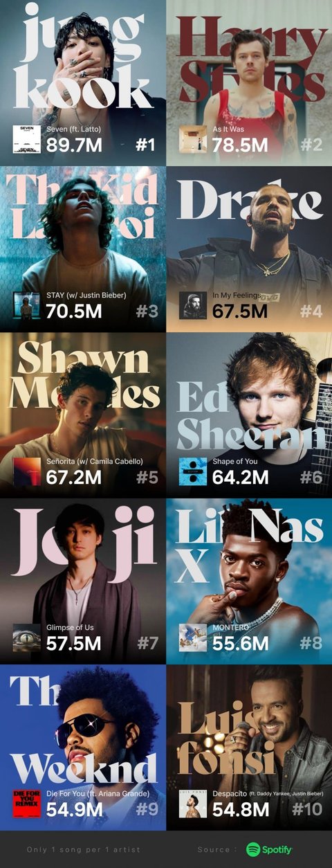 이번주 스포티파이 위클리차트에서 기존 1위였던 해리스타일스의 에짓워즈를 넘기고 역대 전세계 남가수 1위 수치 기록