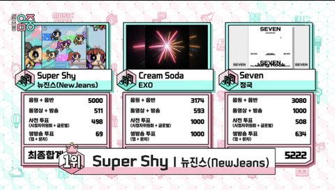 금토일 3일간의 성적만 반영된 솔로 정국한테 진 엑소(엠카) vs 3주전 나온 뉴진스 선공개곡에 진 엑소(음중) 뭐가 더 비침한지 찬반해봐 엑소는 방송출연점수와 음원앨범점수를 모두 다 합쳤는데도 진 것임