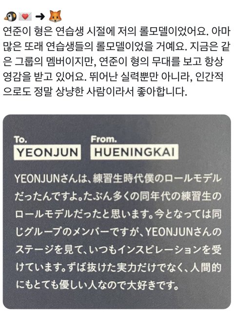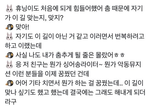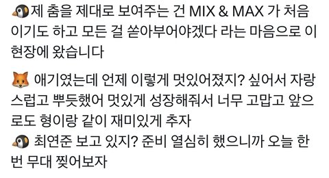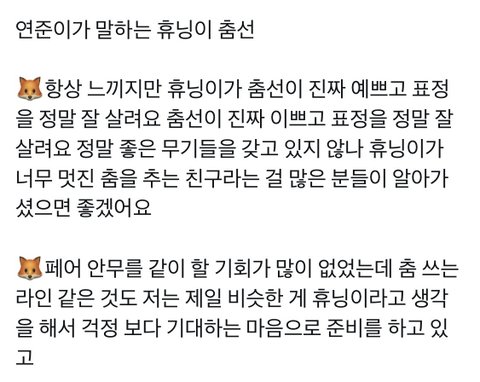 춤에 대해 고민이 많았던 휴닝이가 연습생 시절 롤모델이었던 형이랑 스춤에 출연해서 내 춤을 제대로 보여주겠다 모든걸 쏟아붓겠다 최연준 보고 있지 무대 한번 찢어보자 결연하게 다짐하는거 너무 기특하고 멋있음 ㅠㅠㅠㅠ 3분도 안되는 영상이 이렇게 감동 심할 수가 있어?