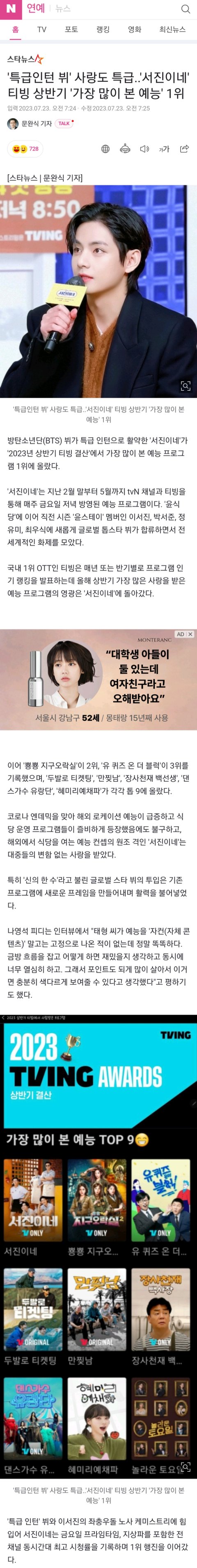 서진이네 티빙 상반기 1위함
