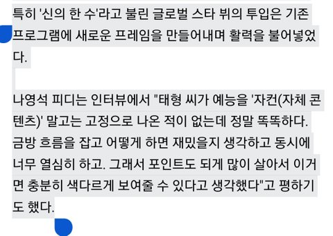 요즘같은 OTT채널 넘치는 시대에 서진이네 티비 시청률도 꾸준히 잘 나왔고 티빙에서도 상반기 가장 많이 본 예능 1위함 이정도면 성공적인것 같음 그리고 나피디님도 태형이 칭찬 많이 하심ㅎㅎ