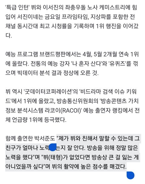 방탄 뷔 출연한 서진이네 티빙 상반기 예능 1위
