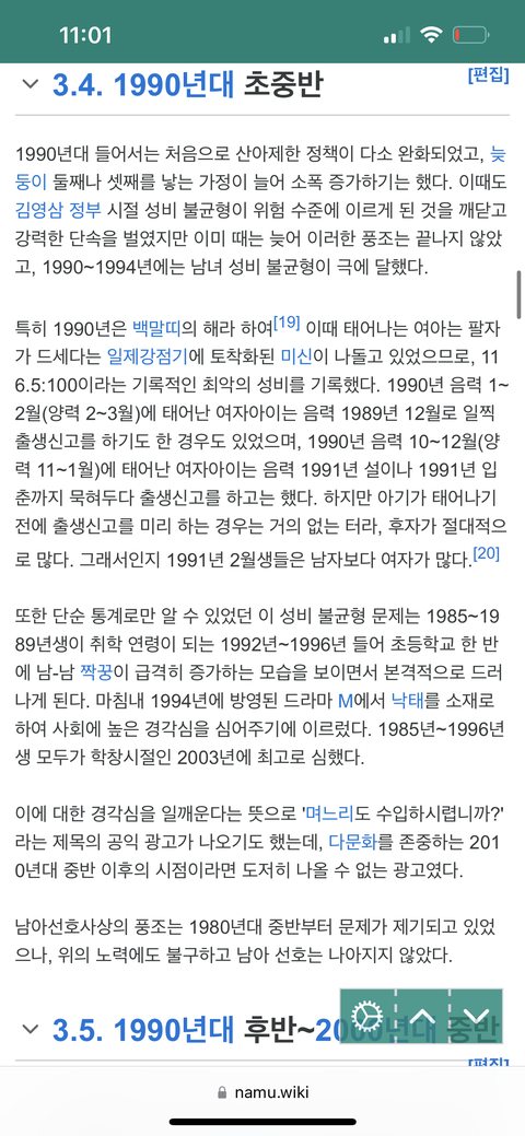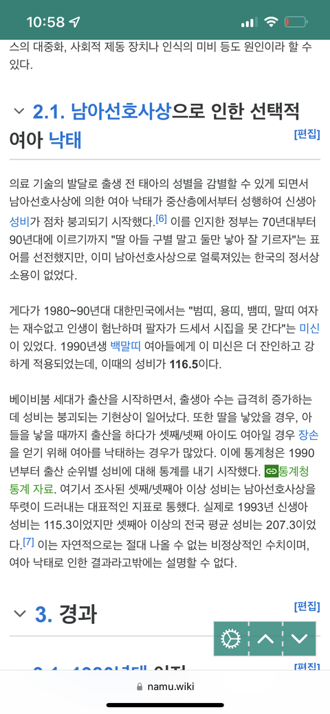 우리 여동생은 90년대생.장남 장녀는ok였지만 셋째부턴 다름.아들이면 ㅇㅇ딸이면 굳이?느낌이어서 부모님이 성별 확정날까지 병원을 엄청 가셨다고.딸이래서 수술날짜 다 잡았는데 그날이후에 장남은 경기일으키고 장녀는 크게 다쳐서 낳으라는 뜻인가보다 하고 수술 취소했다고함.이맘때 성별보고 수술한사람엄청 많음.우리 부모님 또한 고르듯이 딸이라고?지우지뭐 인식했고 그당시에 그런 당연한 흐름이 있었던건 팩트임.
