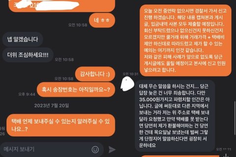 그래서 마지막으로 다음날까지 송장번호 보내주지 않으면 경찰서 가겠다고 톡 보낸 뒤 그 다음날 주말이라 메세지 확인이 늦었데.. 아니 내가 자기 직장 상사도 아니고 주말이면 당근도 쉬는거임? ㅋㅋㅋㅋㅋㅋㅋㅋㅋㅋㅋㅋㅋㅋㅋㅋㅋㅋㅋㅋㅋㅋ