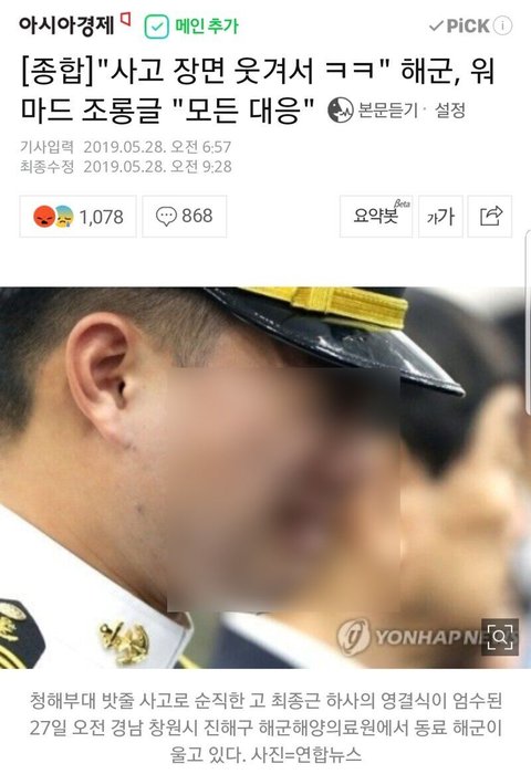 이런 기사 뜬건 페미니즘 사이트 워마드의 순직 해군 조롱 사건 이후 처음인거 같음.