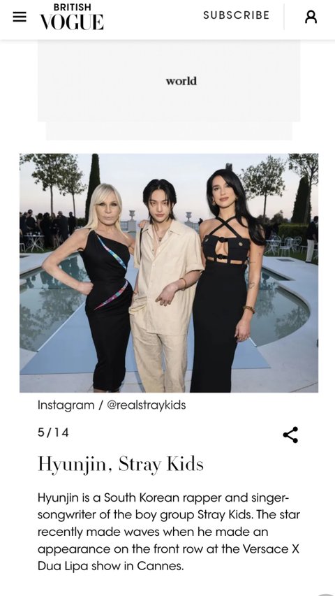 현진은 한국출신 스키즈의 래퍼이자 송라이터로 깐느에서 열린 베르사체×두아리파 쇼의 맨앞줄에 모습을 드러내며 큰 화제를 모았다