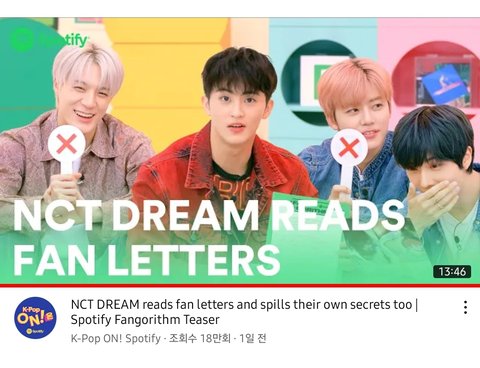 팬들이 드림에게 고마운적 말하는 일화? 같은 코너가 있거등.. 너무 귀엽고 감동적임 특히 한 팬이 수술 해야하는데 너무 긴장하셔서 마취가 안먹혔나봐 그래서 간혹사가 팬한테 듣고싶은 노래 있냐고 물어봐서 Hello future 틀어달라고 했대 근데 듣고 10초만인가? 바로오 잠이 들었대ㅋㅋㅋㅋ