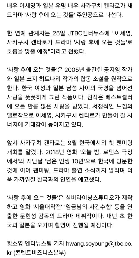 지금 짹 보는데 드라마 팬이든 돌팬이든 자주 찾아보는 계정마다 다 이 소식으로 뒤집어졌더라 사카구치 켄타로가 일본 특유의 찐한 남방계 미남이 아니라 트렌디하게 생겨서 한국에서도 인기 있는 편인데 비슷한 나이대의 한국 여배우랑 같이 영화도 아니고 드라마에서 로맨스 연기를 한다니까 다들 난리던데... 다들 두 사람 작품 움짤 올리면서 얼른 투샷 보고 싶다고 그러더라ㅋㅋㅋㅋㅋ(나도 한번 짤 만들어봄ㅎㅎㅎ)