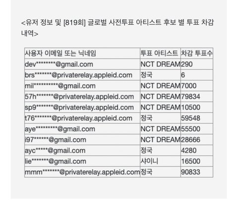 저 표 보면 아미인지 정국팬인지 1명이 19만표 독식해서 부정 갈긴건 알겠음 ㅇㅇ
