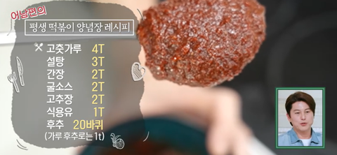 고춧가루 4T, 설탕 3T, 간장 2T, 굴소스 2T, 고추장 2T