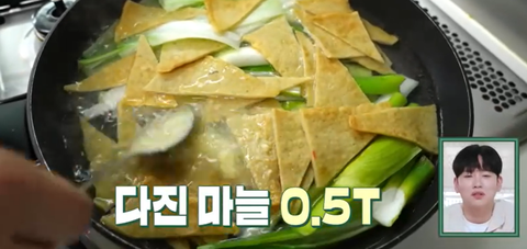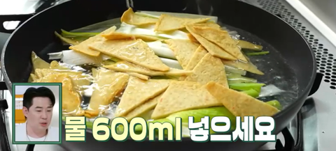 예열한 팬에 대파, 어물 올리고 물 600ml 넣고