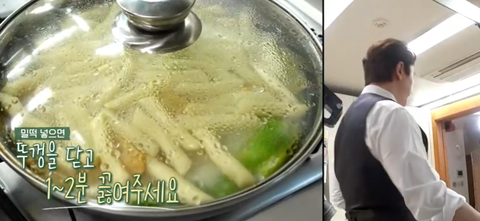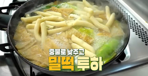 끓으면 중불로 낮추고 밀떡 뚜껑 덮어서 1~2분 끓이기