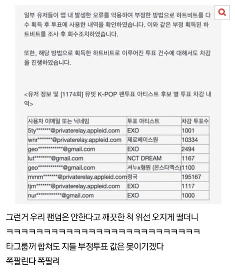 위에 가수팬들 부정툽수 보면 혼자서 115만표 주작한 사람도 있고