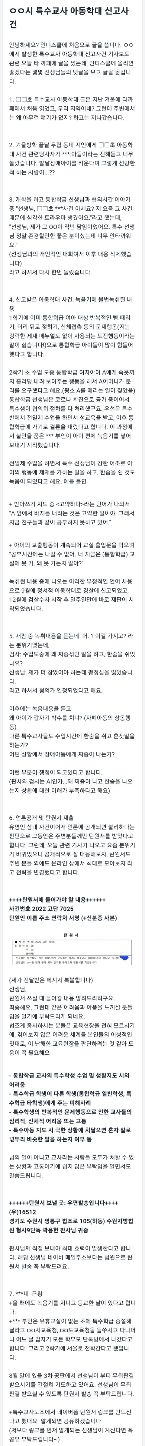 특수아동을 키우고 특수교사 가 필요한 사람으로써 울고싶은 소식이에요.특수교육이 뭔지 잘 모르기에(저또한 남일일땐 몰랐습니다.) 하는 말들이겠죠.일단 장애가 있고 일반아동들의 교육받을 권리를 방해하니 특수학교를 보내라- 대부분의 특수아동 부모는 특수학교에서 특수교사에게 개별화교육을 받고싶을거에요.지역구마다 특수학교가 있는 것도 아니구요.제아이를 보내려면 통학버스만 두시간 가까이 타야합니다.초등은 의무교육이니 꼭 해야합니다.그러면 제 선택지는 일반학교 특수학급이 최선이에요. 이때 특수교사 는 제게 신급입니다.통합으로 수업을 옮겨다니며 적응하고 배우고 밥을 먹고 하교하는 그길까지 특수교사분의 눈길,손길이 필요해요.저는 초등예비맘이라 그런지 이런기사가 너무 충격이에요. 같은 특수반이어도 조용한 ad.자폐 혹은 지체장애친구들에게 폭력적이거나 무방비하게 성기노출등의 행동을 할때 개입하는 특수교사분들이 계시지않으면 나머지 친구들은 어떻게 지내야하는걸까요?