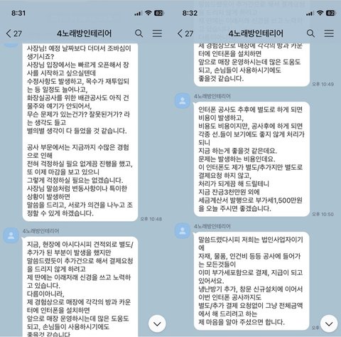 *사건 내용은 이렇습니다. 1억3천6백피해 <재공사견적9천만원노래방 창업을 알아보다 노래방인테리어 카페를 알게되고, 카페 운영자와 대화를 나눠보니15년간 노래방 인테리어 전문으로 일했으며, 수많은 노래방을 오픈했다 하여 같이 진행 하기로 함.