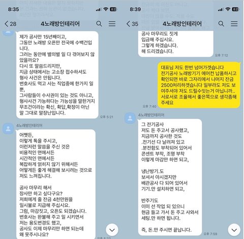계약 내용은 2개월간의 공사로 인테리어 및 에어컨, 노래방기기, 쇼파 등 가게 운용에 필요한 모든 부분에 대해 1억5천만원에 계약.