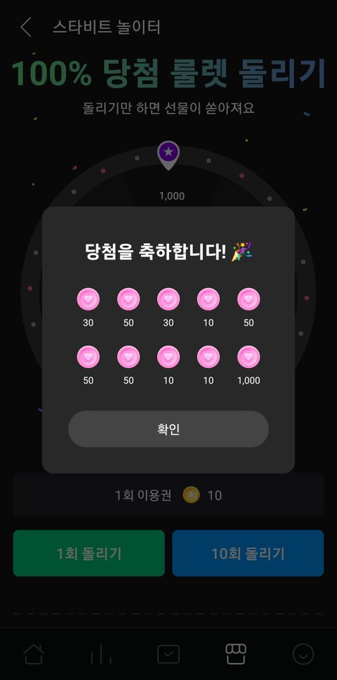 그것은 바로 뮤빗 룰렛~ 1000개 감질맛 나서 계속 돌리고 있어...뮤뱅부터 도대체 얼마 쓴거지...