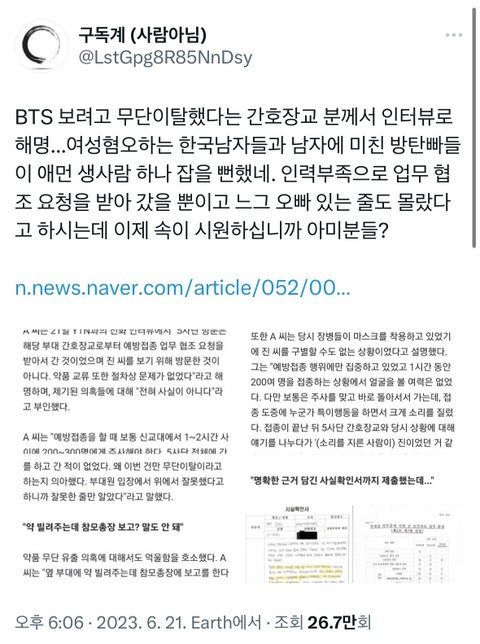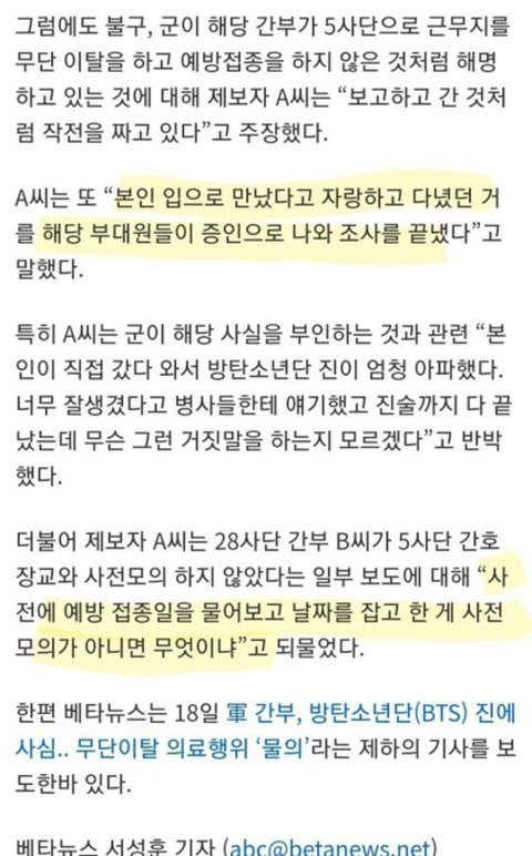 또한 A 씨는 당시 장병들이 마스크를 착용하고 있었기에 BTS 진 씨를 구별할 수도 없는 상황이었다고 설명했다. 그는 "예방접종 행위에만 집중하고 있었고 1시간 동안 200여 명을 접종하는 상황에서 얼굴을 볼 여력은 없었다. 다만 접종 도중에 누군가 특이행동을 하면서 크게 소리를 질렀다. 접종이 끝난 뒤 다른 간호장교와 당시 상황에 대해 얘기를 나누다가 '(소리를 지른 사람이) 진이었던 거 같은데?'라는 말을 들었다. 이 또한 추측이었을 뿐 실제로 진이었는지조차 알 수 없다"