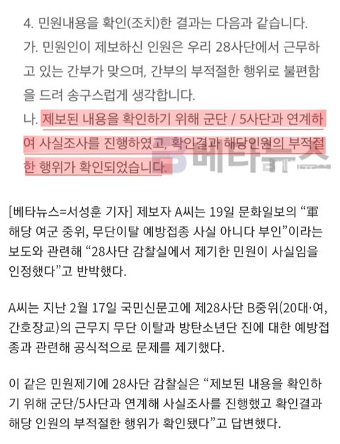 A 씨는 "예방접종을 할 때 보통 1~2시간 사이에 200~300명에게 주사해야 한다. 5사단 전체에 간호장교가 3명뿐이어서 애초에 인력이 부족했고, 마침 사단 전체가 전투 휴무여서 사단 의무대에도 협조 요청을 하기 어려웠다. 저희(간호장교)에게는 업무 협조가 당연한 거였다. 의무 관련 업무를 할 수 있는 사람이 한정적이라 서로 도와야 했고, 선배들도 유선으로 협조했다고 들었다. 선의로 한 행동을 제보자가 왜곡했다."