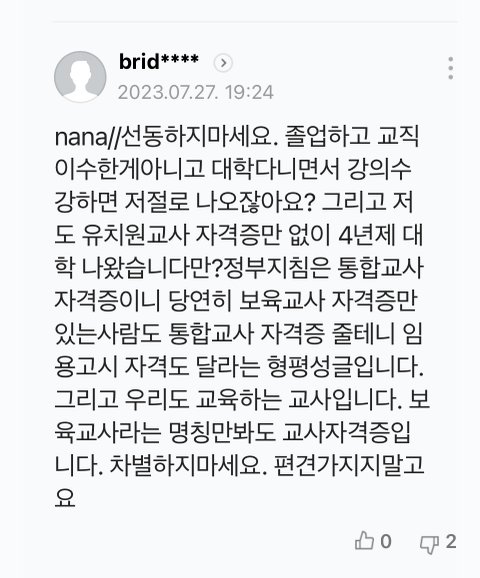 임용은 사범대나 교대를 나와야 칠 수 있는건데ㅎㅎㅎ 떼쓰는 사람 임용치게 해줘도 될까요? 저런 사람한테 아이 맡길 수 있을까요..