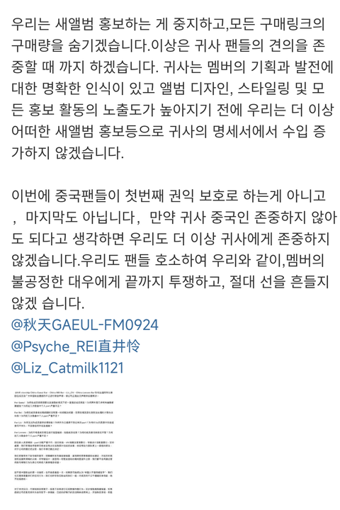 이거봐라 전체팬덤으로 뭉치는 모습보여줘야 한다고 했지 진짜 멍청하면 모래위에 집을짓고 거위의 배를 갈라 진짜 중국애들은 극혐임