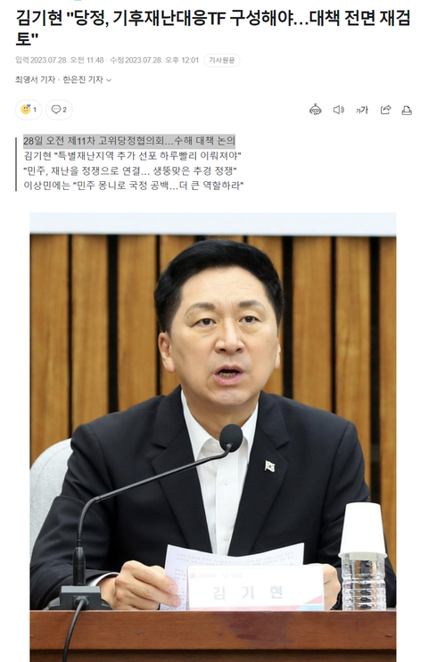 김 대표는 이날 오전 서울 삼청동 총리공관에서 열린 '제11차 고위당정협의회'에서 "당과 정부가 기후재난대응태스크포스(TF)를 만드는 것도 효과적인 논의의 방법이 아닐까 한다"고 말했다.