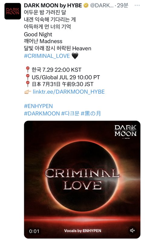 크리미널 러브 선공개 잠깐 들었는데 원빌을 뛰어넘을 띵곡이 나올 것 같아ㅅㅂ 원빌 내 최애곡인데…음방 돌아줘 제발…