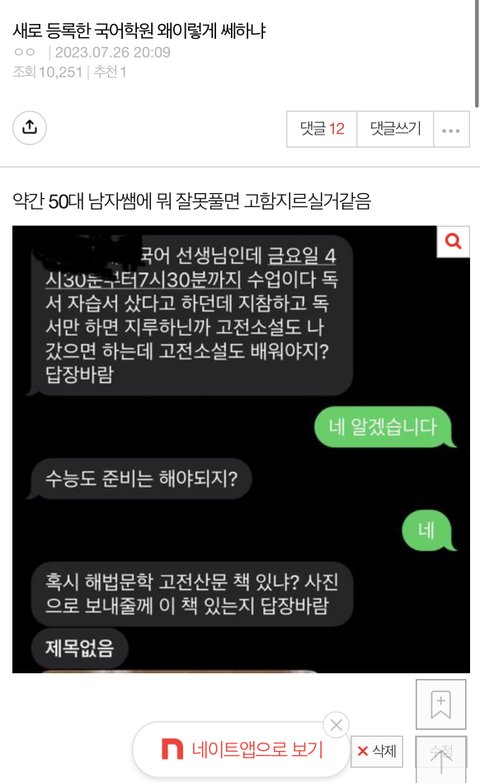 일단 가자마자 이십분동안 이과냐, 어디학원에서 왔냐 하면서 잡담하다가 수업 시작했는데 좀 이상해 고전문학 하는데 글 하나 배울때마다 이건 몇년도 수능 기출이라면서 이 작품 나온 년도를 꼭 쓰라고 하심 (아직도 왜쓰는지 모르겠음) 그러고 걍 본문 전체 읽고 구석에 있는 꼭읽어보기같은것만 별표치고 넘어감 그러다 갑자기 나같이 훌륭한 선생을 두고 어디서 떠돌아왔냐고 하심 ?? 이러고 모의고사 풀고 끝남 이게 맞냐