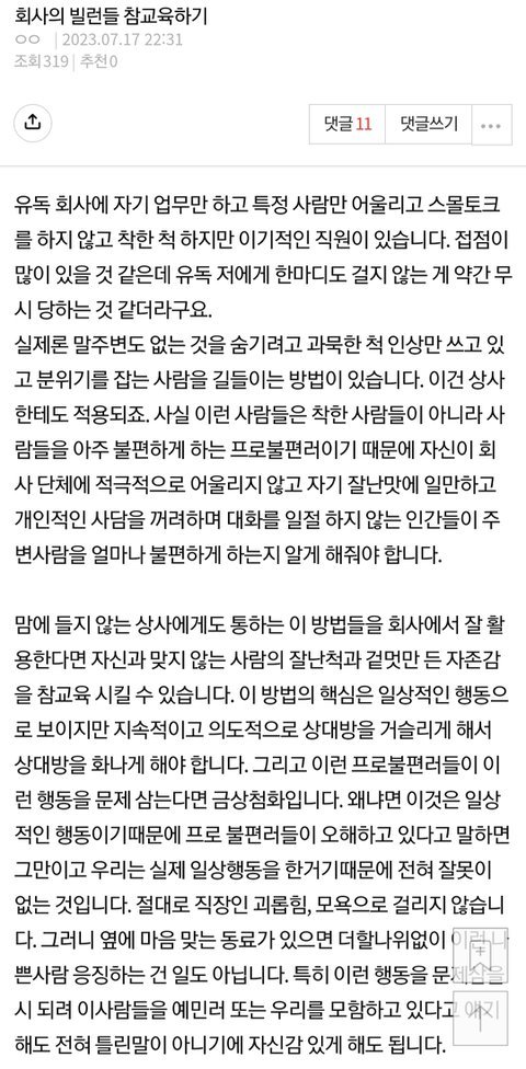 비슷한 경우를 당해봤는데 알면서 방관하는 자들과 주동자옆에 붙어 똑같이 행동하는 인간들도 주동자 만큼 아주 비열하고 악랄한 사람입니다. 저건 법적으로 해결될 수 없다는 걸 악용하고 있어요ㄷㄷㄷ