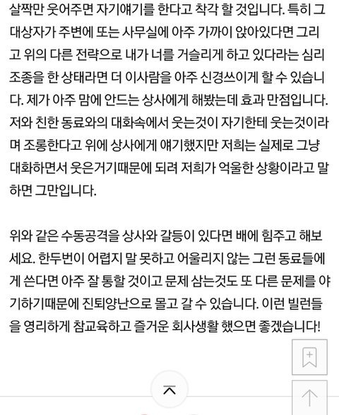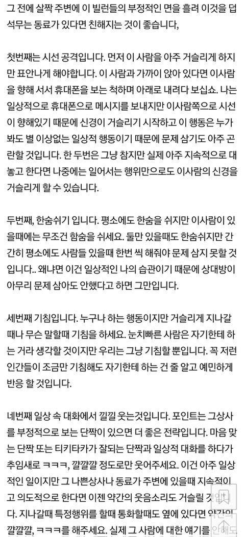 저런 사람 우리회사에 진짜 있어요!!! 근데 더 환장하겠는걸 저는 원래 저렇게 대화를 싫어하는 것도 아니고 그냥 저런 인간들을 본능적으로 느끼고 대화를 피한것 뿐인데 그걸 느끼고 저런 비슷한 행위들을 하고 더 똑같은건 저를 예민한 사람 취급하며 자기들의 잘못을 부인하며 마치 억울하다는 듯이 몰아갔다는 거죠ㅠㅠ 진짜 소름돋네요