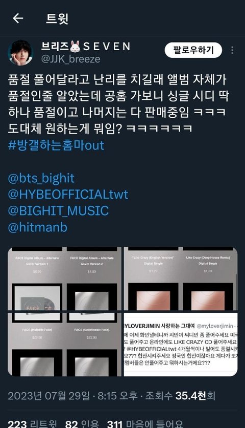 저글을 올린게 갠팬악개라도 지금 다 품절 오류로 몇달째 난리라서 쟤말고도 아미들 다 풀어달라고하는데 ㅈㄱ인장 걸고 ㅈㄹ하는거 개빡침